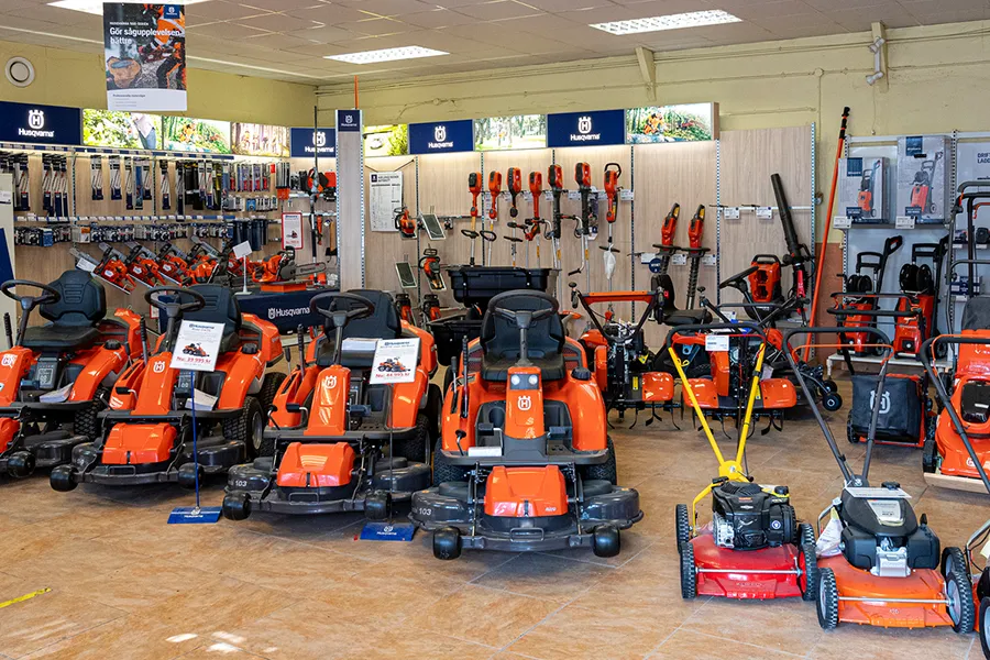 Vi håller hela Husqvarnas sortiment, bland annat gräsklippare, automowers (robotgräsklippare), åkgräsklippare, grästrimmers, skogsröjare, häcksaxar, lövblåsare, motorsågar och tillbehör. De flesta produkter finns för både bensin och batteri/el.