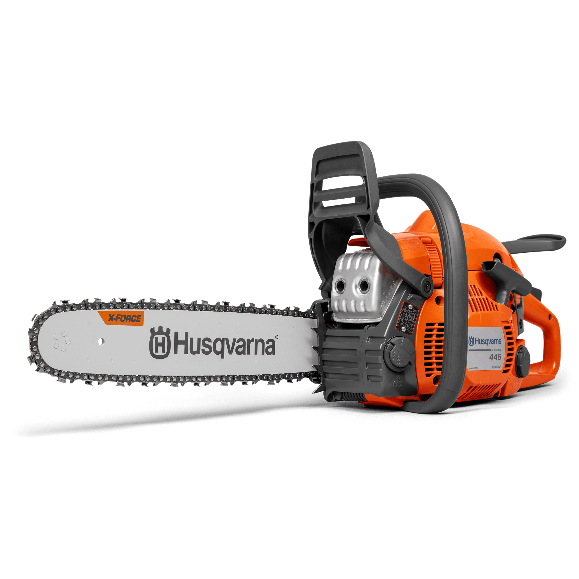 Som markägare har du många krav på en motorsåg. Husqvarna 445 II e TrioBrake™ är en bensinmotorsåg designad för att klara alla jobb på din fastighet. Den bränslesnåla 45cc X-Torq®-motorn ger enorm kraft och lämnar endast ett minimum av utsläpp. Den låga vikten och den smala kroppen minskar belastningen, medan bränslepumpen, de uppfällbara tanklocken, verktygslös kedjespännare, Smart Start® och den automatiskt returnerande strömbrytaren säkerställer enkla, pålitliga starter och smidig hantering. Extra säkerhet med TrioBrake™ fulländar upplevelsen.