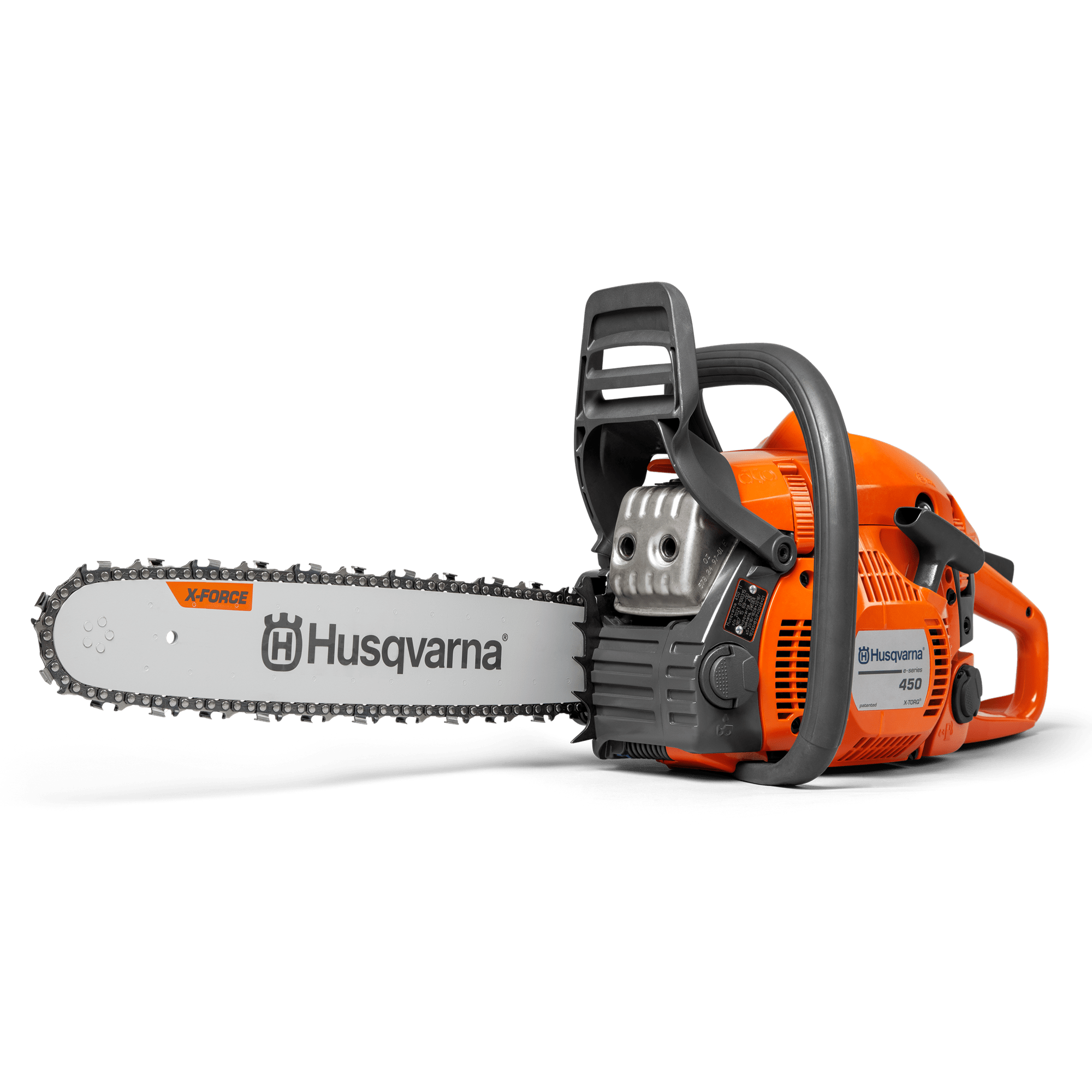 Husqvarna 450 II e är en suverän allroundsåg för markägaren som vill ha en kraftfull såg med professionella egenskaper och som dessutom är väldigt lätt att starta och manövrera. Den bränslesnåla X-Torq®-motorn säkerställer låga utsläppsnivåer och levererar mångsidig skärkapacitet i ett lågviktspaket med en rad funktioner för smidig start och hantering så som uppfällbara tanklock, bränslepump, automatiskt returnerande strömbrytare samt Smart Start® och verktygslös kedjespännare.