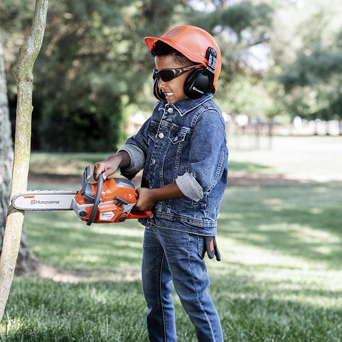 Ser ut som en riktig Husqvarna 550XP® Motorsåg tillsammans med leksaks-skyddsutrustning! Leksaken har realistiskt motorljud och roterande kedja. Passar barn från 3 år och uppåt.