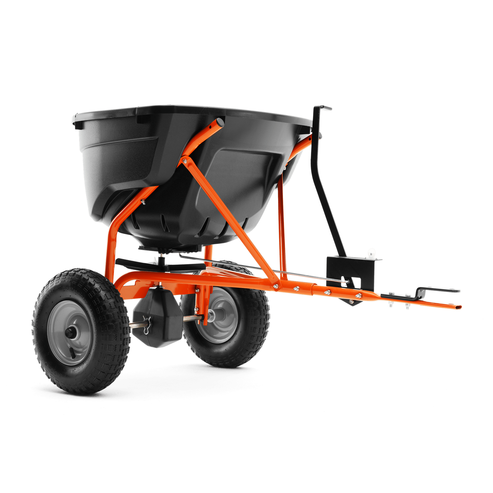 Bogserad spridare till din åkgräsklippare eller trädgårdstraktor med enkel justering av flöde, för större områden. Sluten kommersiell växellåda för jämna drivning och enkelt underhåll och stora däck för enkel manövrering. Slitstarkt nylonskydd inkluderat. Kan användas för att sprida gödning och frön i din trädgård samt för issmältning under vintern. Om spidaren används med salt, se till att rengöra spridartratt och rör efter användning för att förhindra korrosion