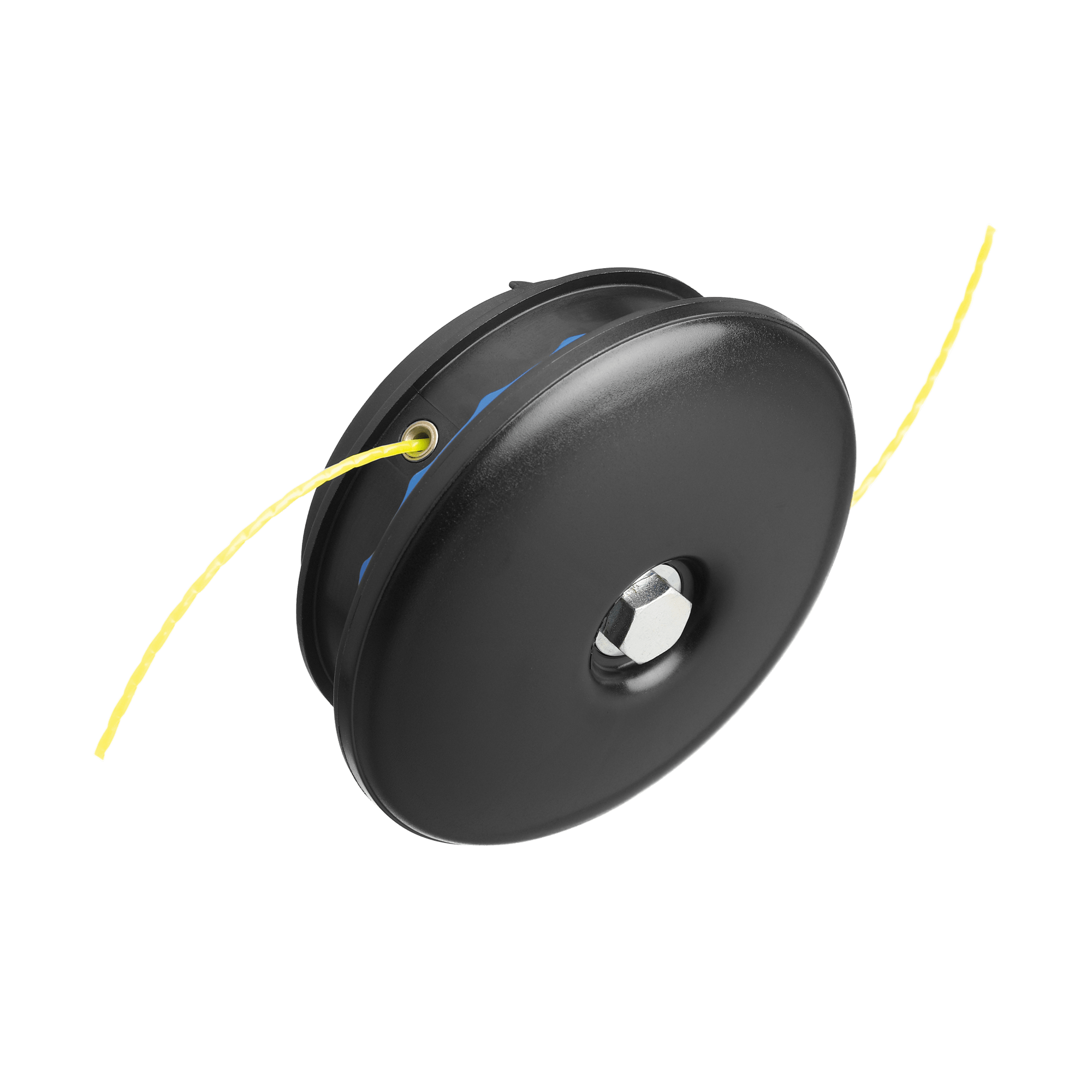 Trimmerhuvud med manuell trådmatning. Användaren matar ut tråden manuellt genom att trycka på trådmatningsknappen och dra i tråden.
